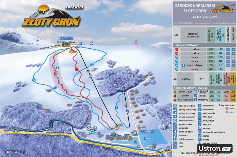 Ośrodek Narciarski Złoty Groń położony jest w malowniczej wsi Istebna, w dorzeczu Olzy. Wyjątkowy mikroklimat sprawia, że śnieg utrzymuje się od listopada do kwietnia, a temperatura jest o kilka stopni niższa, niż w pobliskich miejscowościach. Miłośnicy sportów zimowych mają do dyspozycji bardzo dobrze przygotowane i szerokie trasy o zróżnicowanym stopniu trudności.
